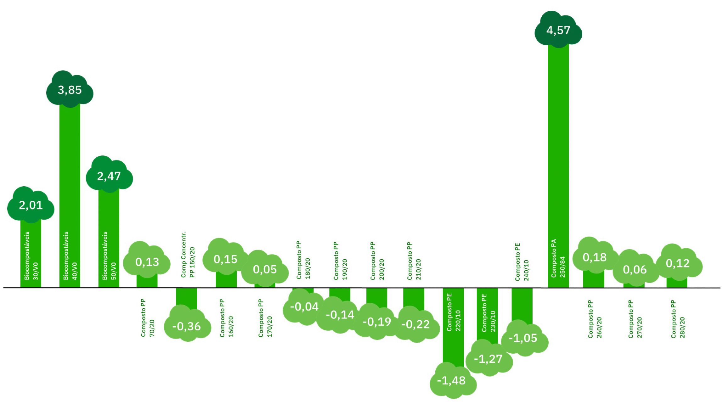 Alguns compostos reciclados ou de origem bio tem uma pegada negativa porque compensam mais CO₂ do que emitem durante seu ciclo de vida. Isso ocorre devido ao uso de materiais de fontes renováveis e processos otimizados.